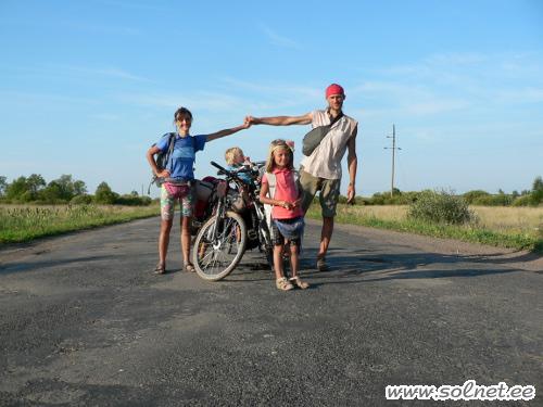 А сколько разных бабочек, насекомых и птиц мы видали, всех и не запомнишь" Мы в этот день еще проходили две деревни, но в них людей не оказалось, и дорог к ним давно нет, только были еще видны, из-под больших растений еще не сломанные избушки. Наша мама сказала, что это страшные места, и она знала, что тут будет страшно потому, что за день до этого нам по дороге попался умерший аист, такой у нее метод сравнительного анализа. Потом нам пришлось переносить все вещи с велосипедами через реку и там уже были в деревне люди. А еще после того, как мы перешли реку, у нас был маленький праздник - мы проехали 600 км и праздновали это компотом с сухариками.