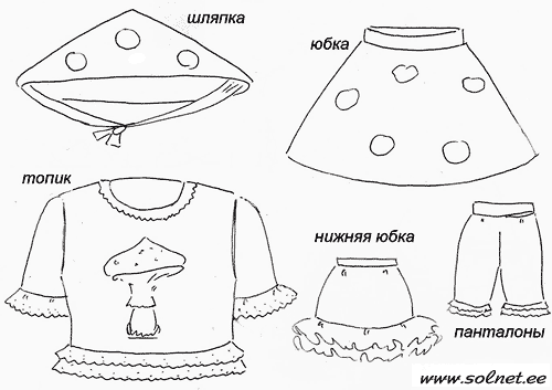 Шляпка. Сшить большой берет: верхняя часть (круг) из красной ткани, нижняя часть (кольцо) из белой ткани. Украсить аппликацией. Можно настрочить круги из ткани, а можно просто наклеить круги, вырезанные из белой самоклейки. Для объема рекомендуется продублировать верхнюю часть берета тонким синтепоном.