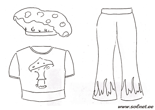 Брюки. Раскроить и сшить из белой ткани брюки по любой выкройке из коричневого габардина. Низ брюк украсить аппликацией "травка" из остатков зеленой ткани.