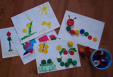 - Предметы для развивающих занятий в буквальном смысле бесплатны: крышки-пробки легко найти на улице во время прогулок, а игровое поле можно нарисовать самим или вырезать необходимые элементы из старых журналов. В случае утери крышек они легко пополнимы.