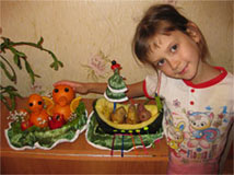 Выставка «Дары осени». Делали утят из мандаринов и ладью из кабачка. Пока делали утят, папа съел один мандарин, и пришлось сделать большого утенка из апельсинов. Было так смешно, когда он съел голову утенка!!! Нам дали диплом за 1 место. Это был семейный конкурс, и нашей семье подарили большую коробку чая и кофе.