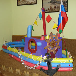 В общем-то, можно было бы обойтись и без корабля, а воспользоваться воображаемым, но так гораздо эффектнее. Построили мы его из большой коробки и noodles - такие мягкие палки для плавания в бассейне, уж и не знаю, как они называются. Сделали из картона якорь с цепью, штурвал, трубу, флажки на мачте, все, как положено. Капитан "надевает" коробку себе на плечи, руки - в иллюминаторы - крутить штурвал, остальные придерживают корабль за борта, так все и движется. На поворотах было сложновато, а так - хорошо. Капитан был один - именинник, но рулевыми все были по очереди. Капитан прошел ускоренный спецкурс с помощью мамы и м/ф про капитана Врунгеля, так что команды вроде "Отдать якорь! Без паники!" отдавал уверенно.