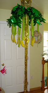 После этого "нашли" банановую пальму, и надо было подпрыгнуть и сорвать банан. Бананы были нарисованные и держались на креп-ленточках, так что отрывались легко, но трудно было рассчитать высоту, т.к. дети были разные. В одном из бананов тоже была монета.