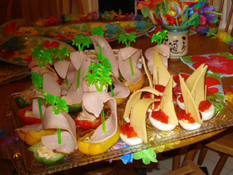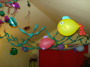Пальмовый остров - это основная территория, большая комната и прихожая. Под потолком мы натянули нитки и на них развесили ленты из креп-бумаги, получились неплохие волны, и еще к потолку привесили больших рыб. Это были воздушные шары, к которым я приклеила хвосты, глаза, рот, плавники. Идея и выкройка взяты из сценария