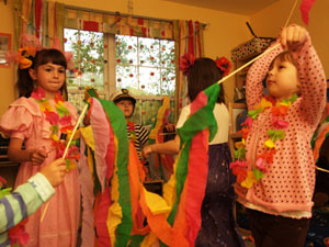 Цветочный остров. Это была детская комната. Туда я собрала все цветы из дома и развесила гавайские цветочные гирлянды - получилось очень красочно. Гирлянды и заколки с цветами потом все одевали на себя, включая мам. Все были красивые. Хотя было больше девочек, мальчики тоже с удовольствием одевали цветочные бусы.
