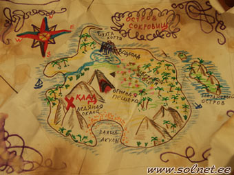 Какое несчастье! Мы так старались, так искали и вот - остались без торта! Что же нам делать? Но дети уже сами догадались - надо искать летучих рыб! Вот тут-то и нашлись заранее приготовленные рыбы-шарики. В каждой из них лежал кусочек карты, и нужно было поймать рыб, а потом "вспороть им брюхо" и достать кусочки карты. Я боялась, что дети будут бояться лопающихся шаров, но было очень весело. Каждому досталось по рыбе. Шары лопались, все разноцветные наклейки с них отлетали во все стороны, так что получился настоящий салют (можно было бы еще насыпать туда конфетти). В конце концов, все кусочки были найдены, карту собрали, склеили. Карта была боевая, залитая, подпаленная, как положено. Вот такая: