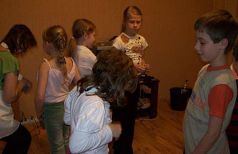 Чтобы детки, до которых не дошла очередь объяснять, не оглядывались и не подсматривали, а также для пущей таинственности можно натянуть какое-нибудь полотно. Откровенно говоря, эта мысль мна пришла в голову только сейчас. Тогда и конкурс можно назвать "За покрывалом".