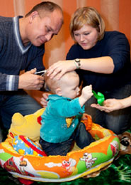 После тоста вместо крестной встала мамина подруга Таня, а вместо крестного - двоюродный дядя Сережа, его сын. Ростика усадили на коврик и отрезали по традиции у него часть волос. После