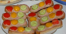 На прямоугольный кусочек хлеба намазать паштет, из разноцветного сладкого перца, огурцов и помидоров вырезать формочкой для печенья кружочки подходящего размера.