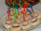 Круглой формочкой вырезать колесики из хлеба и колбасы, добавить кружочек соленого огурца, соединить шпажкой.
