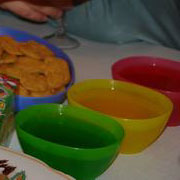 "Светофорное" желе (трёх цветов в трех круглых посудинах соответствующего цвета), печенье в форме машинок и торт.