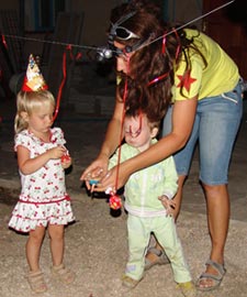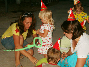 срезать подарки, то я включила этот конкурс. Упаковав в подарочную бумагу, подвесила маленькие резиновые мячики. Конечно же, предварительно спрятав букву "Т" под одной из упаковок. Все происходило на морском побережье, дул ветер, и одной рукой срезать было нелегко, не у всех это получилось быстро.