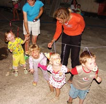 К каждому на пояс привязывалась конфета на тонкой нитке так, чтобы при беге она обязательно волочилась на земле. Суть игры: нужно догнать конфету другого, при этом не дать наступить на свою. Но нашим трехлеткам, конечно же, было интересно догнать конфету и съесть ее.:) В одной из конфет была спрятана первая буква "Л".