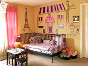 Очень удачно подобраны наклейки на стены с французской тематикой к интерьеру этой детской комнаты для девочки.