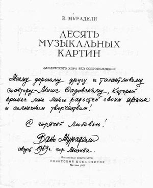 Его любимое произведение было "Горийские песни" на народные тексты и стихи Иоанисиани, Исаакяна, Овнатяна, Туманяна, Шираза... Говорят, весь тираж этого сборника в 1948 году сожгли в каминах дома композиторов в Рузе... Только в конце шестидесятых они возникли вновь в замечательном исполнении Сергея Яковенко... Когда Вано умер, на его сердце врачи нашли огромный рубец от перенесенного инфаркта, как они установили, примерно, сорок восьмого года, и отметили, что такую боль мог скрыть только могучий человек (никто тогда и не подозревал об этой его болезни) - это была плата за перенесенные несправедливые унижения, он из неграмотной крестьянской семьи поднялся до вершин власти, боготворил эту власть и ненавидел её представителей: "Нам, малым народам, надо крепко друг за друга держаться, не то они (он поднимал палец вверх) нас сожрут! - так говорил он мне. - А меня скоро разоблачат: посмотри, у меня в штате одни евреи работают. Одна не еврейка, так и та Флора Арамовна!"; когда он умер, со мной перестали здороваться многие из тех, кто подобострастно уверяли в дружбе и публично это демонстрировали; когда он умер, через месяц перестали исполнять его песни по радио, по телевидению, но они до сих пор не забыты людьми, значит, он был прав, а не сводившие с ним счёты; когда он умер, создали "Всесоюзную комиссию по творческому наследию Вано Мурадели", и меня включили в её состав... но она ни разу не собралась... Когда он умер, обозначилось совершенно очевидно его высокое место в ряду выдающихся талантов, его современников... И долго пустовал его кабинет, по-моему, две зимы, - замены не было... Когда он умер, были сытные поминки... В его гостеприимном доме за тем огромным столом, где он обычно сам переписывал свои клавиры, выводя ноты таким каллиграфическим почерком, что невозможно было понять: это напечатано или написано чёрной тушью обычным пером, которое он макает в бутылочку, а перед тем каждый раз вытирает огромной, белоснежной, лежащей на этом же столе простыней... Когда он умер, я так ничего и не взял себе на память, как предлагала по традиции Наталья Павловна, только пошёл в его кабинет, сел на его стул у рояля с открытой клавиатурой и долго сидел. Долго. На пюпитре стояли нотные листы с не разгадываемыми намётками мелодии, а на крышке две фотографии: слева в серебряной рамке портрет его мамы, справа в обычной снимок двух моих дочек.