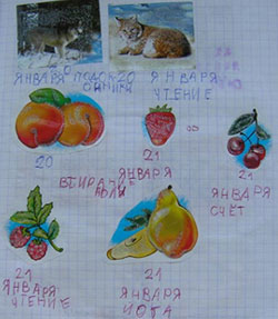 Что получаем? Наклейки "живут" в тетрадке, а не расползаются по всей квартире. Если ребенок делает надписи самостоятельно, то он работает с календарем, учится правильно писать слова и закрепляет знание цифр.