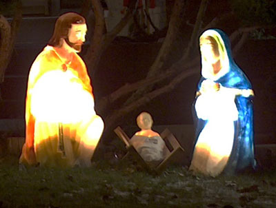 У другого дома - снеговики и белые медведи... А у третьего - Дева Мария склонилась на маленьким Иисусом, а рядом стоят ягнята... Конечно же, это всего лишь фигуры, но на фоне ночного неба они словно оживают.