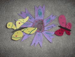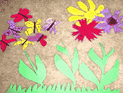 Бабочек приклеем к цветочкам. Стебли и цветочки приклеим к синей бумаге. |