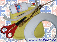 Для работы понадобятся: проволока (мы купили изолированный провод и очистили его), ножницы, уплотнитель для окон белого цвета (он самоклеющийся, но ничего страшного), зелёный двухсторонний картон (если нет такового, то картон, цветная бумага и клей), зелёный карандаш.