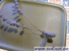 3. Затем на проволоку нанизываем наши квадратики. Сделаем две такие заготовки: одну длинную, другую - чуть покороче.