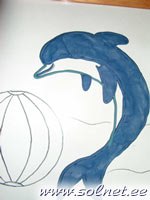 5. Когда контур выложен, начинаем заполнять оставшиеся пустоты. Делаем лепёшечки и накладываем, слегка размазывая их по стеклу. Там, где глазик у дельфина, мы просто накладываем лепёшечку и СЛЕГКА прижимаем её, чтобы контуры глаза не размазались