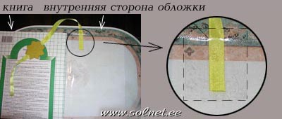 Посмотрим, что получается с обратной стороны, когда книга в обложке (место прикрепления тепрь внутри, но т.к. обложка прозрачная, скотч немного видно):