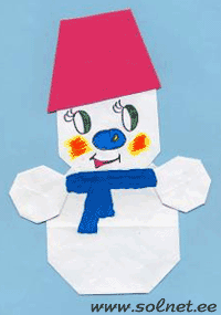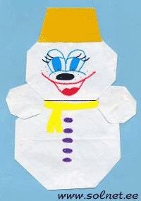 3. Сложите ведро: загните две боковые стороны по произвольно намеченным линиям и переверните фигурку на другую сторону. Наденьте ведро на снеговика.
