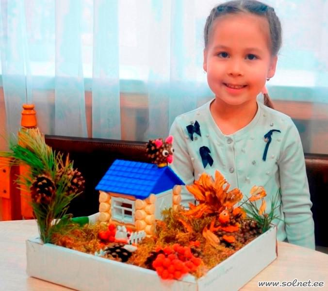 Ход работы: в коробку выкладываем мох, украшаем макет домиком, далее из веточек, листьев делаем деревья.Из шишек и пластилина делаем животных.