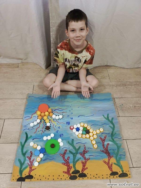 На большом листе картона наметить места где будут располагаться рыбки, кораллы, медуза. Раскрасить картонное полотно, чтобы визуально получилась часть суши и воды. Нарисовать разноцветные кораллы и черные камни. Дать работе время просохнуть. Приклеить пластиковые крышечки, чтобы получились очертания рыбок и медузы. На кораллы нанести с помощью ватной палочки точки (для объема, по желанию).